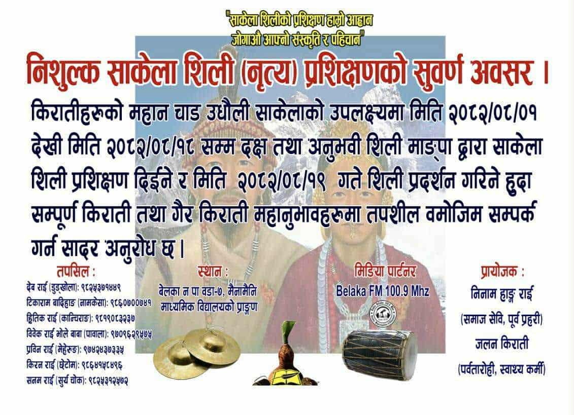 प्रशिक्षण आगामी मङ्सिर १ गतेदेखि १८ गतेसम्म माध्यमिक विद्यालय मुलगाउँमा हुने जनाएको छ। त्यसैगरी, मङ्सिर १९ गते उधौली चाडको अवसरमा राष्ट्रिय कलाकारहरूद्वारा साकेला शिली प्रदर्शन र कन्सर्ट कार्यक्रम समेत आयोजना गरिनेछ।