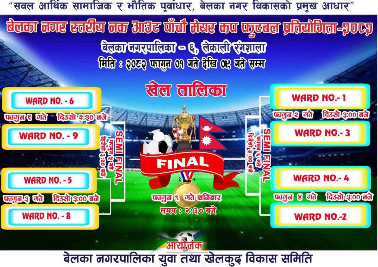 माघ २८ बेलका । बेलका नगरपालिका–६, लेकाली रंगशालामा “बेलका नगर स्तरीय नकआउट पाँचौं मेयर कप फुटबल प्रतियोगिता-२०८२” हुने भएको छ। आज बेलका नगर युवा तथा खेलकुद बिकास समितीको पेज बाट फागुन १ गते देखि ९ गते सम्म उक्त प्रतियोगिता हुने खेल तालिका सार्वजनिक गरिएको हो ।